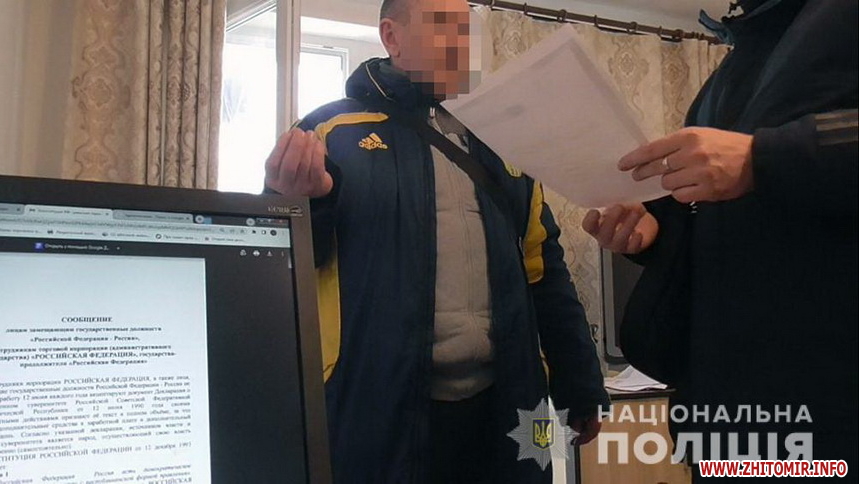 Дізнавачі Житомирського райуправління ГУНП спільно з співробітниками УСБУ в області 11 квітня викрили 54-річного жителя обласного центру у протиправній публічній діяльності на підтримку російської збройної агресії та з тих же причин провели санкціонований обшук в іншого житомирянина.