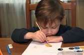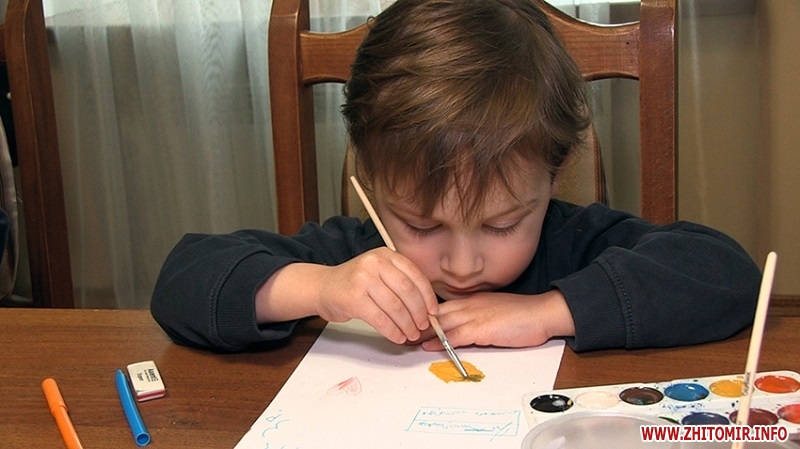 «Я малюю хмаринку, сонечко, райдугу і будинок. Для військових малюю. Прийшов з моїм братиком Германом. Він малює прапор, ще щось жовтим малює і сердечко»,— розповідає Прохор.