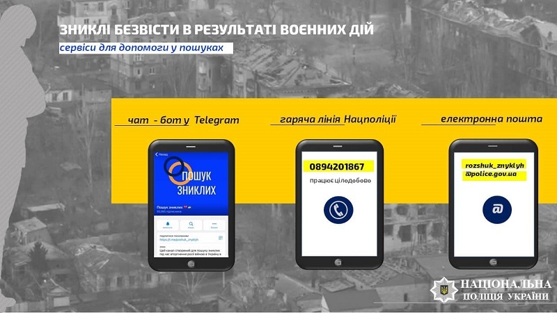«Шукаєте зниклих близьких? Повідомте про них Національну поліцію України. Ми розширюємо функціонал гарячої лінії для родичів загиблих 089 420 18 67. Відтепер за цим номером також можна подати заяву про безвісти зниклих осіб», – йдеться у дописі.