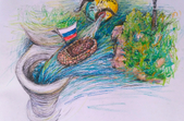 Що затонув саме корабель – то я вважаю, ніякої різниці, чи це літак, чи танк. У будь-якому разі зло піде на дно. Але так, у мене зображений корабель, який тоне у водах Тетерева, а Тетерів теж впадає у Чорне море.На малюнку два береги – берег любові Жито поєднується містком з берегом Миру. А між ними намагався проплисти русомир. І от серед жита і миру гине цей зліплений зі зла корабель. Все зло повинно піти на дно, тому я втопив його у водах Житомира під нашим мостом. Знаєте, квантова фізика зараз доказово доводить, що всі порухи нашої душі, наші думки матеріалізуються. Все те, що ти задумав, втілюється в життя. І я дуже щасливий і задоволений, що так сталося.