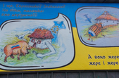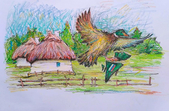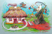 – Краї паперу обмежені, туди все не втілиш. Тому використовую обмежену кількість символів. Як вже говорив, головний – це українська хата, як символ добробуту, миру, сім'ї. Хатки з руками, очима. Вони – образи тих бабусь, які годують російську падлу пиріжками з пургеном, усього народу, усього живого, що піднялося на оборону від зла. Навіть на коминах у хаток не дим, а оселедець. У вигляді цих хаток країна від села до міста піднялася на боротьбу з фашистами.