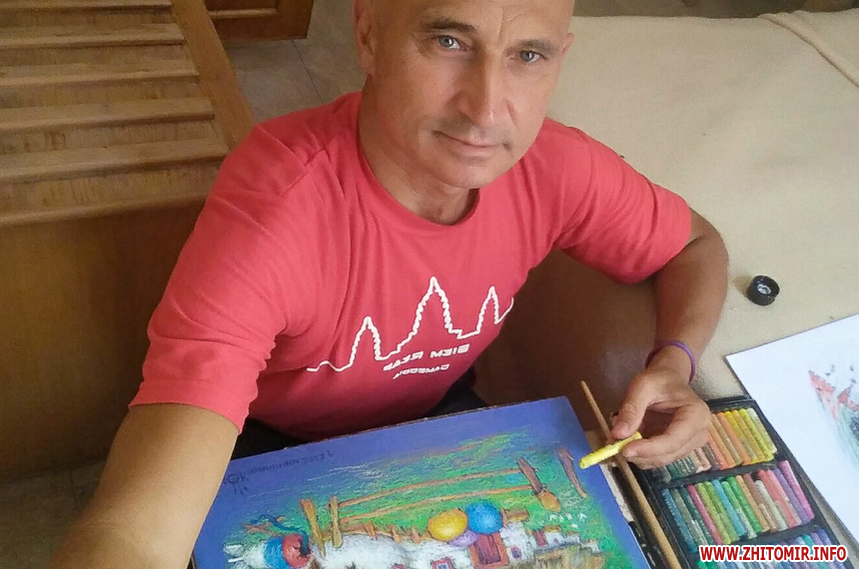 – Зараз малюю графічні ілюстрації, так би мовити, українські комікси пастеллю. По-перше, у мене зараз немає доступу до інших матеріалів. Та й олійна техніка у мене дуже повільна – я роками працював над олійними картинами. А графіка дала мені змогу вже створити більше 12 робіт. Навіть ці начерки я роблю по декілька діб. Найшвидшою стала робота, яка зараз на білбордах в Житомирі. Вона була створена дуже швидко, і я не допрацював її, і її вибрали прикрашати наше місто. Зараз дуже хочеться додати, доробити, переробити цю роботу і зробити її художньо коштовнішою. Мало хто знає, але на цьому малюнку на мості був напис "Сухомлин". Звісно, він не святий, ніхто не сперечається. Проте він не втік з Житомира, він робить багато для міста, заради миру. Але коли брали малюнок на борди, то цей напис замалювали, мер вважав це нескромним.