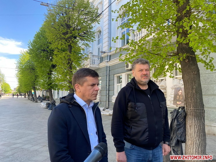 У Житомирі на Михайлівській 6 травня керівник обласної військової адміністрації Віталій Бунечко та мер Сергій Сухомлин проводять брифінг щодо ситуації з паливом.
