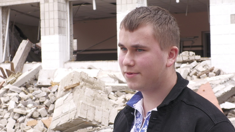 Директор ліцею Іван Денисюк показує, який вигляд має заклад всередині: без дверей та вікон, на підлозі розкидані залишки книжок та зошитів, стіни потріскані, а в актовому залі досі під завалами стоять стільці для глядачів.