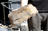 Олександр показує місце, де ймовірно впала бомба. Він розповів, що сьогодні прибираючи завали, знайшов уламок, який планує передати СБУ. Чоловік має надію, що будинок відбудує місцева влада.