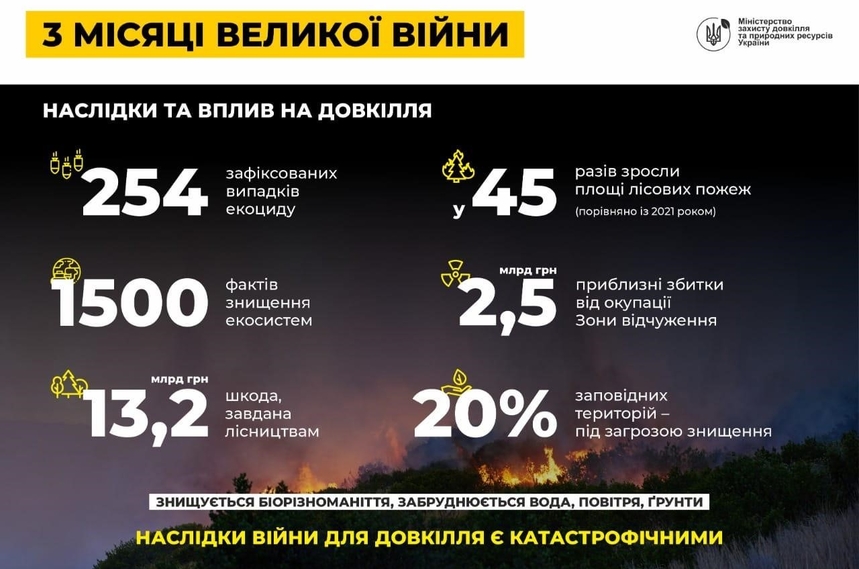 Внаслідок ракетно-бомбових ударів, здійснених російською федерацією, навколишнє середовище зазнає непоправної шкоди. Лише пожежі у Житомирській та Рівненській областях, спричинені обстрілами нафтобаз, завдали збитків довкіллю на понад 200 млн грн.