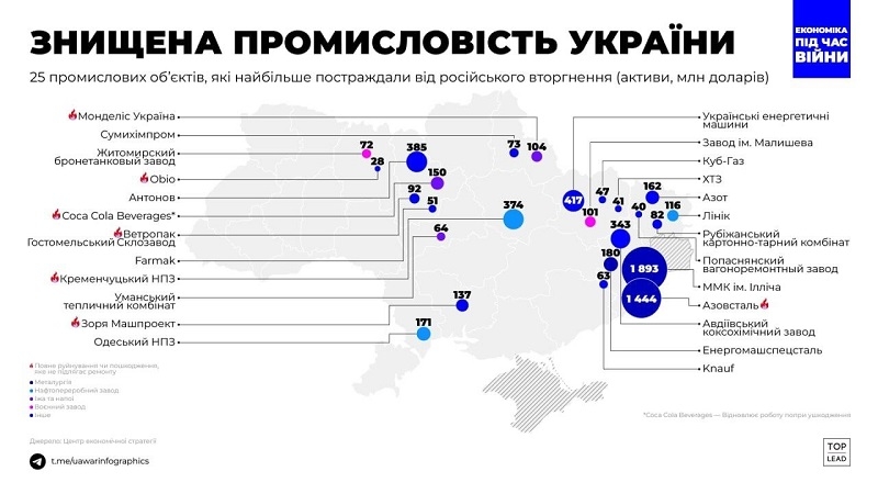 У дайджесті також названі 25 промислових об’єктів, які найбільше постраждали від російського вторгнення. Серед них і два житомирських підприємства – бронетанковий завод і ТОВ «ОБІО» («Ізоват»).