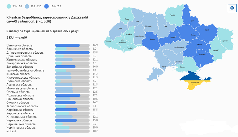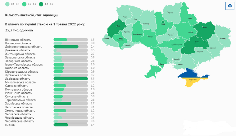 Кількість вакансій в цілому по Україні станом на 1 травня 2022 року становила 25,3 тис. одиниць. Найбільше – у Львівській області: 3,3 тис., найменше нині – на Херсонщині: лише 100 вакансій.