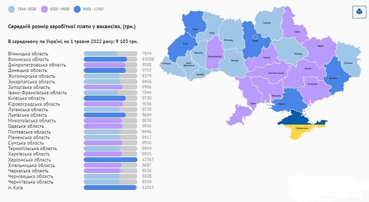 Середній розмір заробітної плати у вакансіях по Україні станом на 1 травня 2022 року становив 9 103 грн. Найвищий середній розмір зарплати, що пропонують роботодавці, – у Херсонській області: 12367 грн. Майже стільки ж пропонують і в Києві – 12055 грн. Найнижчий середній розмір зарплати у вакансіях в Івано-Франківській області – 7844 грн – та Вінницькій – 7874 грн. У Житомирській області у вакансіях пропонують в середньому 8379 грн.