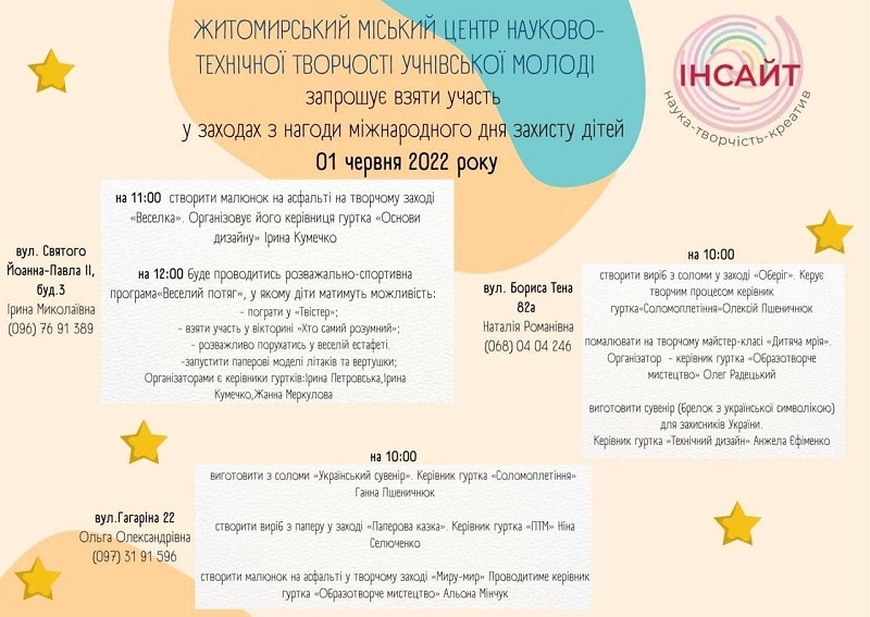 Заходи до дитячого свята організував і Житомирський міський центр науково-технічної творчості учнівської молоді. Локації – вулиця Йоана Павла ІІ, буд. 3, вулиця Гагаріна, 22 та вулиця Бориса Тена, 82-а. У програмі – створення малюнка на асфальті, виготовлення із соломи українського сувеніру, виготовлення виробів із паперу тощо.
