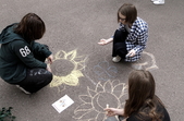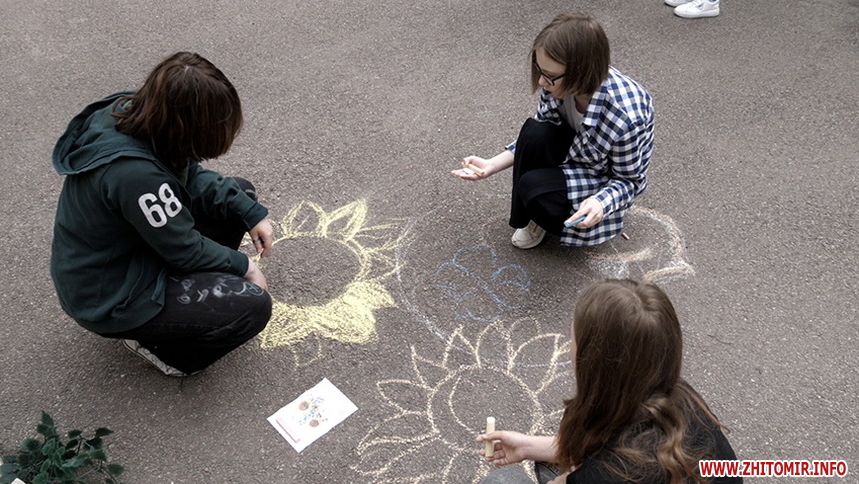 «Сьогодні студія образотворчого мистецтва підготувала малюнок на асфальті тематикою «Миру - мир». Другий етап – це аплікація, щоб діти згадали, як було чудово, коли світило мирне сонце і було мирне небо. Майстер-клас з соломоплетіння – це буде подарунок воїну», – розповідає методист Житомирського міського центру науково-технічної творчості учнівської молоді Ольга Вітюк.