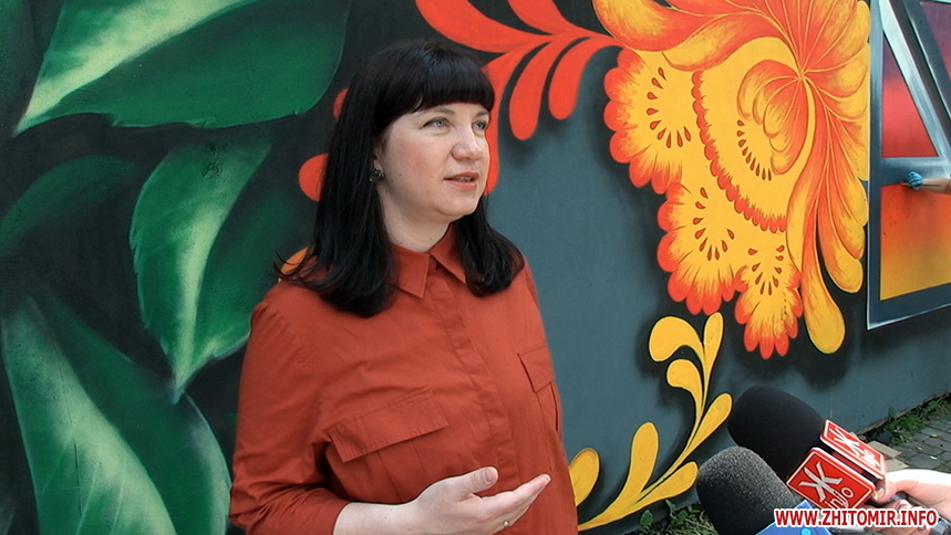 «Сьогодні завершили роботи над розписом цього муралу, це одна з трьох частин великого проєкту, який має назву «Підтримка мам та дітей в умовах війни в Україні». Його основна мета в тому, щоб через арттерапію, через творчість допомогти дітям і батькам переключитися, покращити свій психоемоційний стан», – розповідає авторка ідеї, голова Житомирської обласної молодіжної громадської організації «Паритет» Наталія Тарасенко.