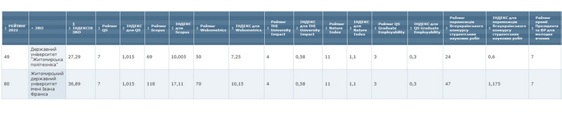 Як повідомляв Житомир.info, в оприлюдненому в лютому 2022 року міжнародному рейтингу університетів світу Ranking Web of Universities (Webometrics) «Житомирська політехніка» була на 51 місці, ЖДУ ім. І. Франка – на 73, Поліський національний університет – на 133.
