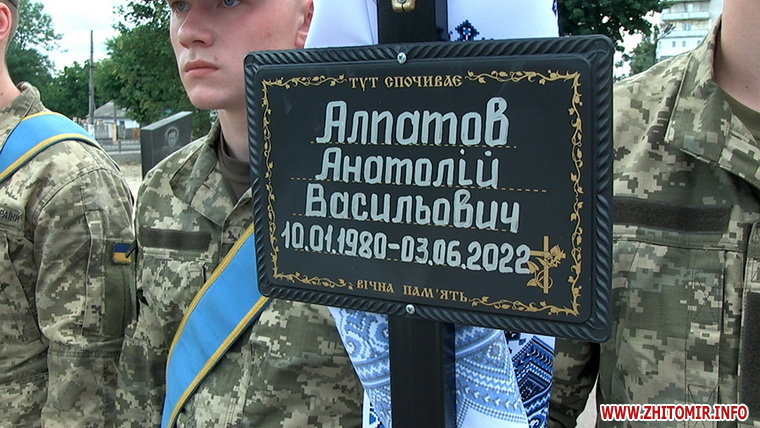 «Сьогодні наше місто та вся Україна прощалася із захисником, житомирянином, військовослужбовцем 95-ї окремої десантно-штурмової бригади з Алпатовим Анатолієм Васильовичем. Анатолій Васильович наш корінний житомирянин, який закінчив ЗОШ № 24, а потім навчався у сільськогосподарському технікумі і з початком повномасштабної агресії росії він став на захист нашої Батьківщини. На жаль, загинув від підступного нападу ворога, захищаючи наші східні рубежі, 3 червня 2022 року. У Анатолія Васильовича залишився батько, а також малолітній син», — розповідає керівник центру допомоги учасникам бойових дій Ярослав Весельський.