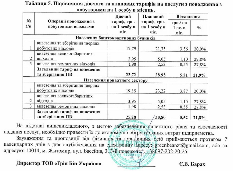 Як повідомляв Житомир.info, 10 листопада 2020 року на позачерговій сесії міської ради затвердили нових виконавців послуг з вивезення побутових відходів у Житомирі: на 4 з 6 визначених територій міста послуги надає ТОВ «Грін Бін Україна». В травні 2021 року міська рада повідомила, що ТОВ «Ґрін Бін Україна», ПП «КВЖРЕП №8», КАТП 0628 мають намір змінити тариф на вивіз сміття.