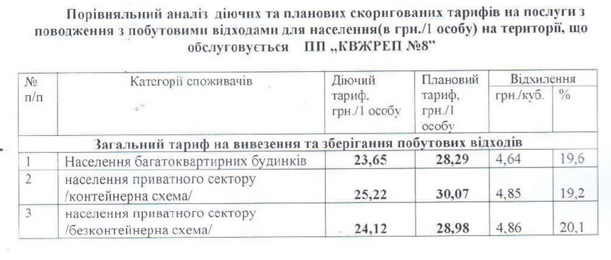 «Діючий тариф не забезпечує відшкодування фактичних витрат на надання послуг з поводження з побутовими відходами, рівень відшкодування діючим тарифом витрат становить 75%. Причиною необхідності коригування тарифів на надання послуг поводження з побутовими відходами, а саме вивезення побутових відходів, є зростання складової собівартості послуг «витрати на паливо» в 1,94 рази (з 28,99 грн/л дизпалива в діючих тарифах до 56,30 грн/л в скоригованих тарифах», - таке пояснює надає ПП «КВЖРЕП №8».