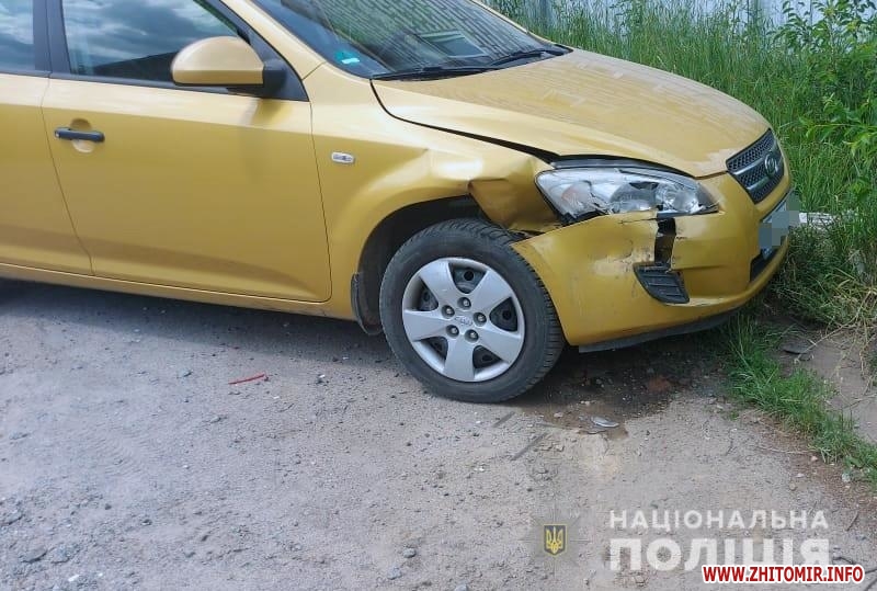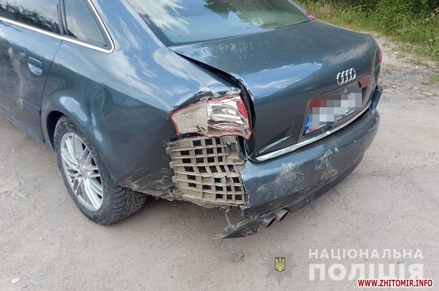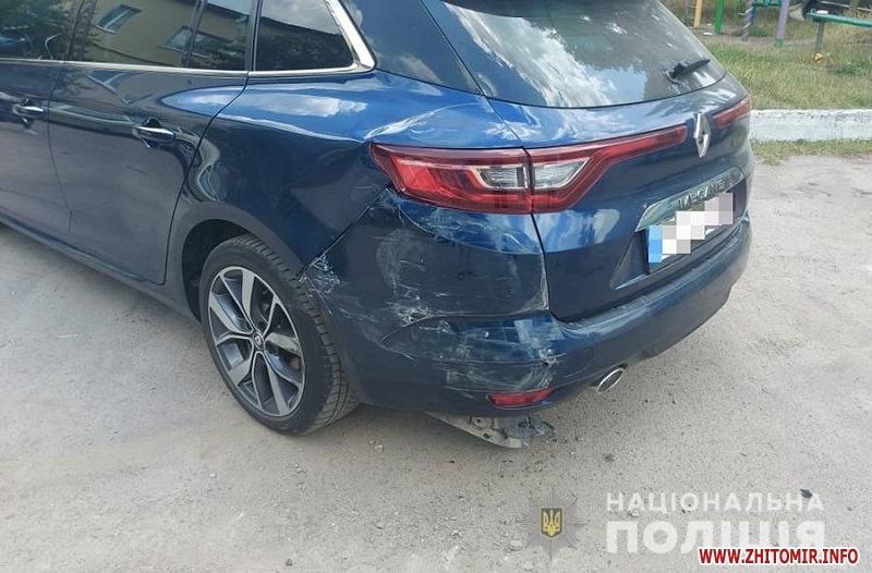 «Попередньо, водій автомобіля Audi A6, 46-річний місцевий житель, рухаючись заднім ходом, здійснив зіткнення з нерухомим Renault Megane, унаслідок чого транспортний засіб посунувся та збив з ніг 51-річну бердичівлянку. Жінка впала та отримала травму руки. У подальшому водій Audi розпочав рух уперед та допустив зіткнення з припаркованим поряд автомобілем KIA Ceed, а потому допустив наїзд на паркан з металопрофілю», – йдеться у повідомленні.