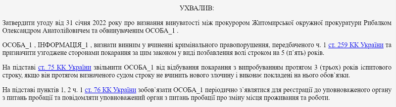 «Відповідно до угоди про визнання винуватості, укладеної 31 січня 2022 року під час досудового розслідування між прокурором Житомирської окружної прокуратури Рибалком О.А. та підозрюваним ОСОБА_1 , за участю адвоката Сінченка А.О. у кримінальному провадженні, внесеному до Єдиного реєстру досудових розслідувань за № 12022060400000165 від 25.01.2022 визнав себе винним у вчиненні кримінального правопорушення за обставин, які викладені в повідомленні про підозру та в угоді, зобов`язався беззастережно визнати свою винуватість в судовому провадженні», – сказано у вироку.