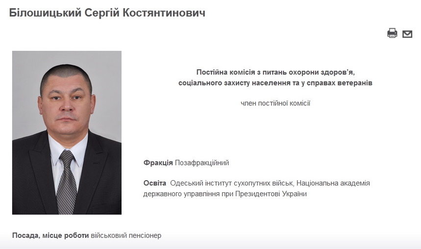 Нагадаємо, Сергій Білошицький був обраний депутатом Житомирської облради від ОПЗЖ, фракція цієї партії з 15 березня 2022 року припинила своє існування в облраді і тепер Білошицький позафракційний. Зауважимо, що Сергій Білошицький є співзасновником кількох громадських організацій, зокрема – «Кіборги Полісся» (був керівником до липня 2017 року) та «Захист та справедливість» (був керівником до травня 2018 року). На сайті облради (див.скріншот) зазначено, що Білошицький - військовий пенсіонер.