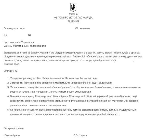 «Затвердити структуру та чисельність виконавчого апарату Житомирської обласної ради згідно з додатком. Доручити голові Житомирської обласної ради або особі, яка виконує його обов’язки, затвердити штатний розпис виконавчого апарату Житомирської обласної ради не пізніше ніж за 14 днів з моменту прийняття рішення та, у разі необхідності, вносити у нього зміни в межах затвердженої чисельності. Доручити голові Житомирської обласної ради або особі, яка виконує його обов’язки, внести зміни в положення про управління та відділи виконавчого апарату Житомирської обласної ради, затвердивши їх відповідно до структури та чисельності виконавчого апарату Житомирської обласної ради згідно з затвердженими управліннями та відділами на момент їх утворення», - йдеться у проєкті рішення.