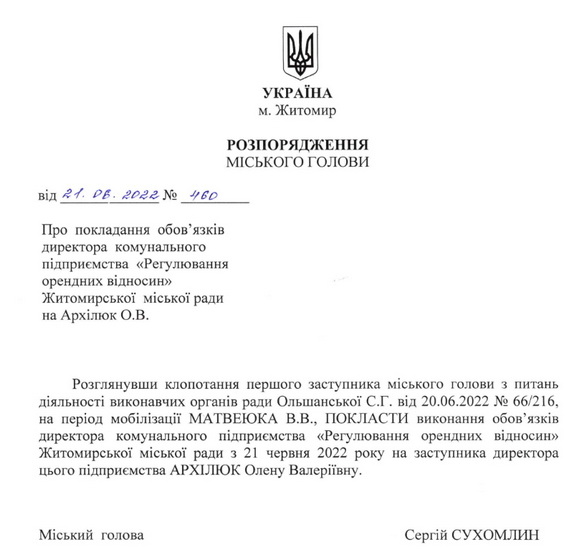 Є також зміни у керівництві комунального підприємства «Регулювання орендних відносин»: на період мобілізації директора КП Валерія Матвеюка з 21 червня 2022 року обов’язки керівника виконує заступник директора Олена Архілюк.