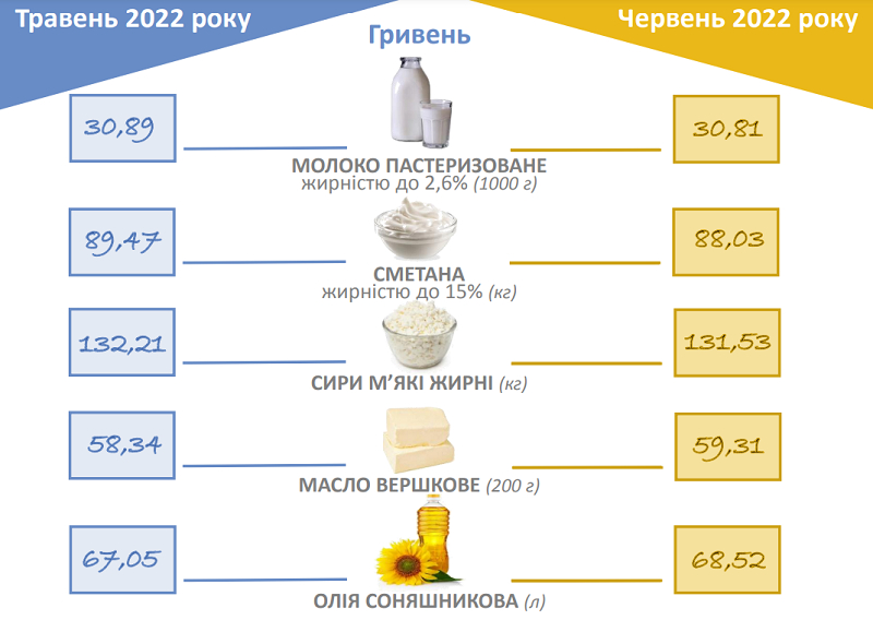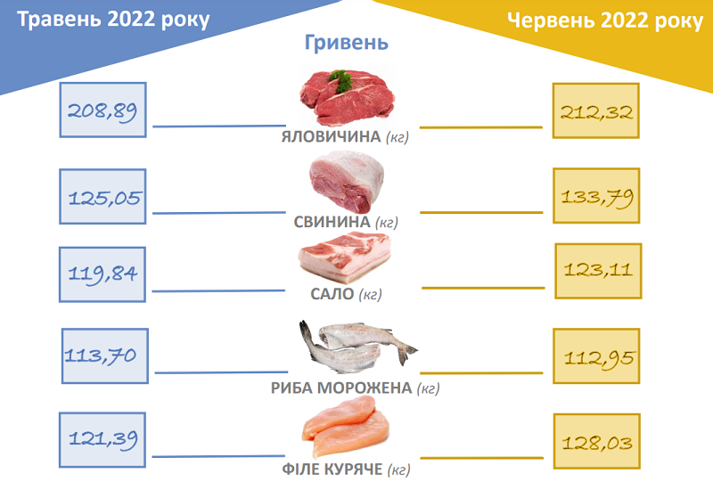 Так, за даними статистиків, у червні, порівняно з травнем, усе м'ясо подорожчало: яловичина у перший місяць літа коштувала в середньому 212,32 грн за кілограм (у травні – 208,89 грн), свинина – 133,79 грн (у травні – 125,05 грн), філе куряче – 128,03 грн (у травні – 121,39 грн). Подорожчало і сало: було в середньому по 119,24 грн, стало 123,11 грн. Ціна на рибу за місяць майже не змінилася, навіть дещо знизилася: була 113,70 грн, стала 112,95 грн.