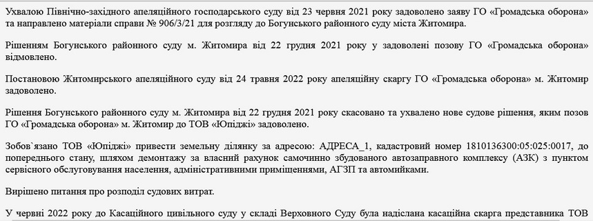 Нагадаємо, 24 травня 2022 року Житомирський апеляційний суд скасував рішення суду першої інстанції і задовольнив позов громадської організації, яка вимагала знести заправку UPG у Житомирі на проспекті Незалежності, 29.
