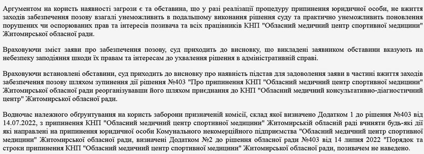 зупинити дію рішення №403 від 14 липня 2022 року «Про припинення КНП «Обласний медичний центр спортивної медицини» Житомирської обласної ради реорганізувавши його шляхом приєднання до КНП «Обласний медичний консультативний центр» Житомирської обласної ради», яке прийнято на пленарному засіданні одинадцятої сесії Житомирської обласної ради 8 скликання до моменту вирішення справи в суді;