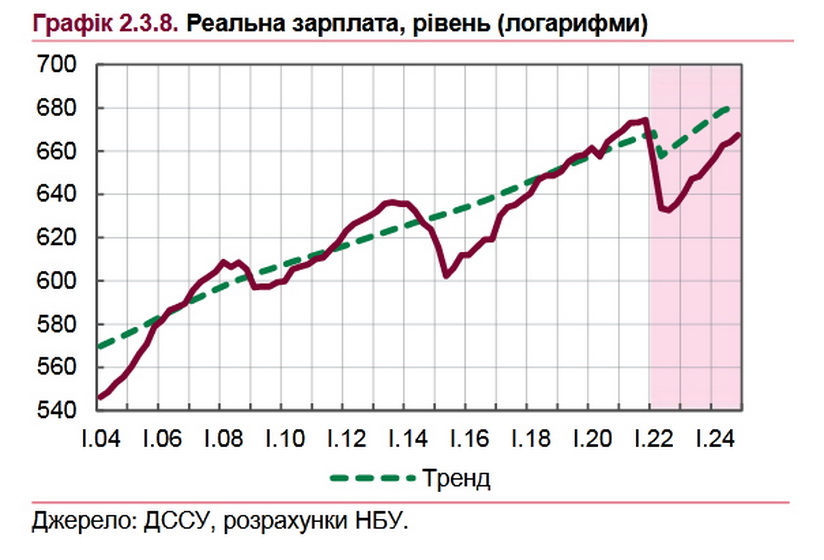 «За різними опитуваннями, падіння зарплат у приватному секторі в травні становило від 25% до 50% порівняно з довоєнним часом. Дещо краща ситуація, за оцінками на основі видатків бюджету, у бюджетному секторі. Крім того, втрата доходів населення від праці частково компенсувалася соціальними допомогами, підвищенням пенсій та значним збільшенням виплат військовим», - йдеться в інфляційному звіті.