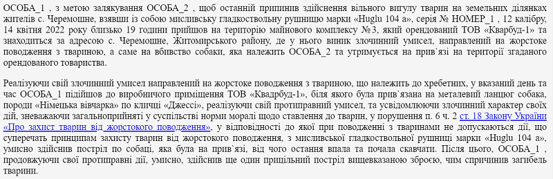 Вирок щодо кримінального правопорушення за ч. 1 ст. 299 КК України («Жорстоке поводження з тваринами») Житомирський районний суд ухвалив 26 липня 2022 року. В Єдиному державному реєстрі судових рішень вирок оприлюднили 27 липня.