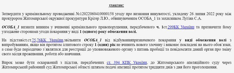Скриншот з вироку Житомирського районного суду від 26.07.2022 року
