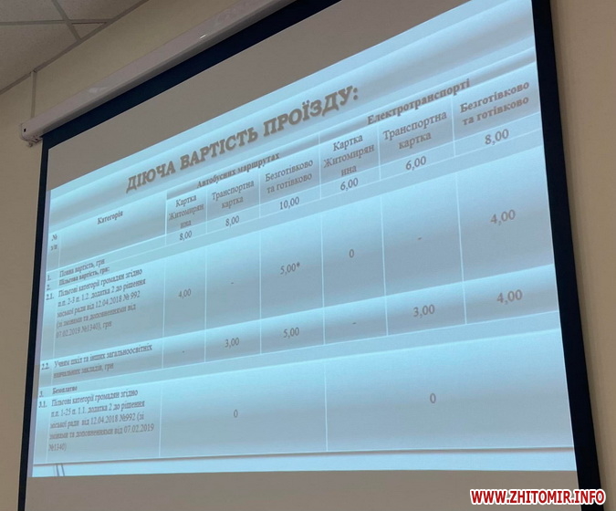 Як повідомляв Житомир.info, з 29 січня 2021 року в Житомирі діє такий тариф на проїзд у громадському транспорті: готівкова оплата в електротранспорті – 8 грн, в маршрутках – 10 грн, транспортною карткою було дешевше. За 2021 рік громадський транспорт Житомира перевіз 54,5 млн пасажирів, 66% яких обрали електротранспорт – тролейбуси та трамваї – і більшість з них були пільговиками.