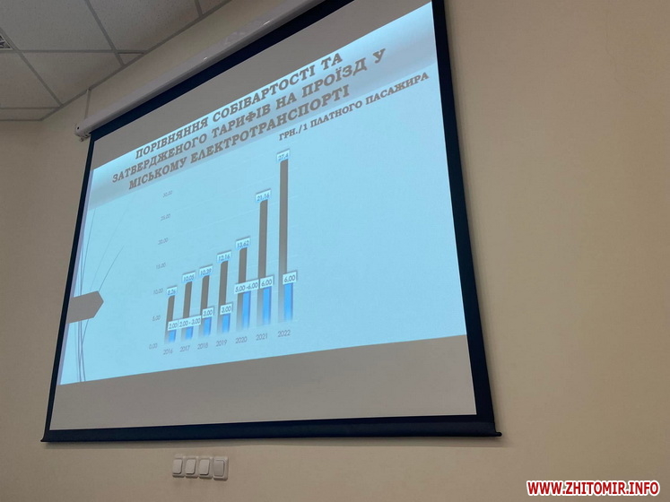 «Ми маємо на даний час вартість про їзду в електротранспорті в розмірі 6 грн по «Транспортній картці» та «Картці житомирянина», банківською картою і готівкою – 8 грн. На автобусних маршрутах у нас по «Транспортній картці» та «Картці житомирянина» - 8 грн, банківська карта та готівковий розрахунок – 10 грн, але ми знаємо, що на даний час у нас валідатори в автобусах не встановлені, тому все йде на рівні 10 гривень... За поданими розрахунками комунального підприємства «Житомирське трамвайно-тролейбусне управління» собівартість (перевезення) одного платного пасажира складає 27 грн 40 коп., а затверджений тариф у нас 6 гривень (про 8 грн за готівку не згадали – ред.), різниця між собівартістю та затвердженим тарифом компенсується з бюджету Житомира. На автобусних маршрутах за розрахунками комунального підприємства та приватних перевізників середня собівартість складає 21 грн, а затверджений тариф 10 гривень. І чим більше ця різниця, тим більш суттєво це впливає на безпеку руху, якість надання послуг та технічний стан транспортних засобів», - сказав в.о. начальника управління транспорту і зв’язку Олег Самарін.