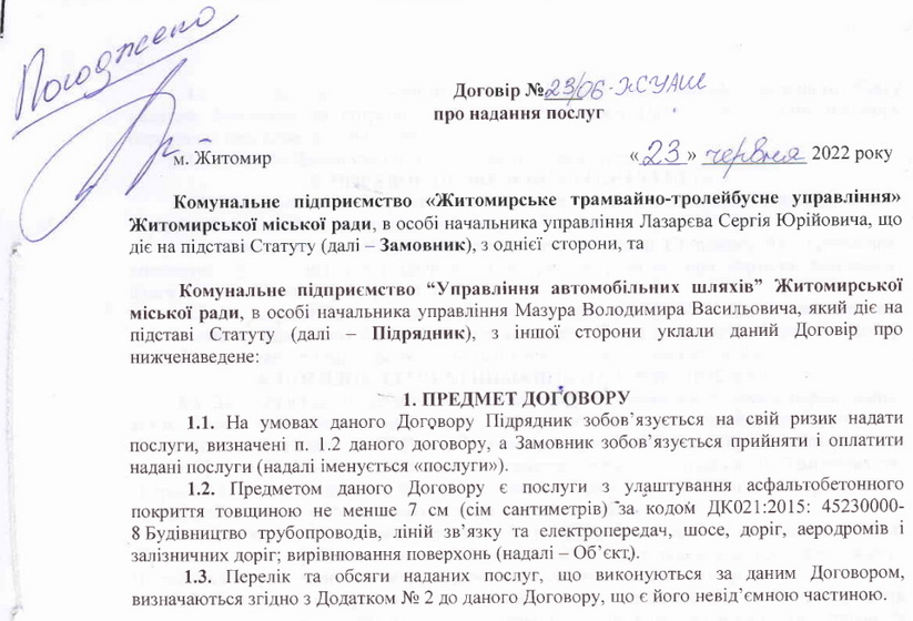 Комунальне підприємство «Житомирське трамвайно-тролейбусне управління» уклало угоду з комунальним підприємством «Управління автомобільних шляхів» на послуги «з улаштування асфальтобетонного покриття» площею 500 кв.м на чотирьох вулицях.