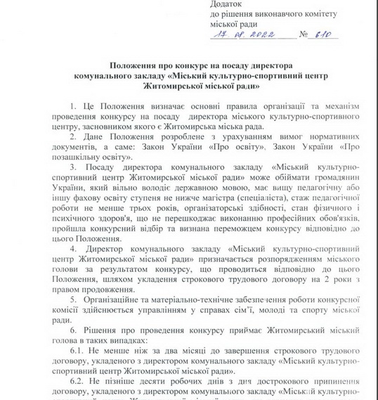 У Житомирі 17 серпня оголосили конкурс на посаду директора міського культурно-спортивного центру міської ради.