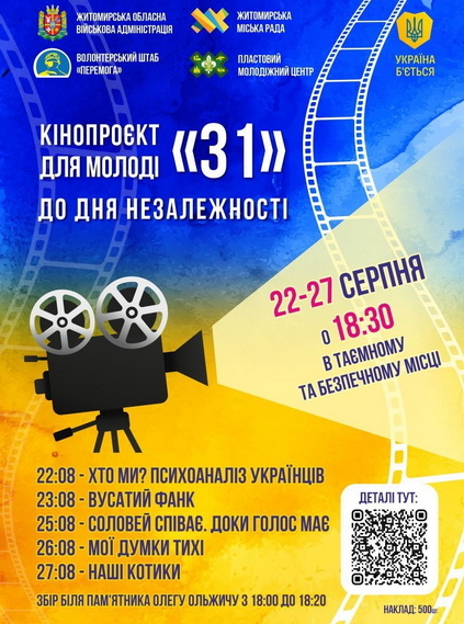 «Запрошуємо на спеціальний кінопроєкт для молоді «31», який відбудеться у Житомирі в рамках святкування Дня Незалежності України! Впродовж тижня, з 22 по 27 серпня, в одному з укриттів міста, пройде кінопоказ п'яти фільмів, які має побачити кожен українець», - йдеться у повідомленні.