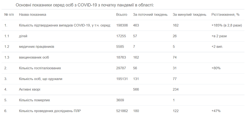 «Захворюваність COVID-19 в Житомирській області щотижня зростає. Всього з початку пандемії зареєстровано 199306 випадків, показник на 100 тисяч населення становить 16589,2. За звітний тиждень (15.08.2022-21.08.2022) зареєстровано 463 випадки захворювання, показник 38,5 на 100 тис. населення, тобто відбувся ріст захворюваності майже в 3 рази», – йдеться у повідомленні.