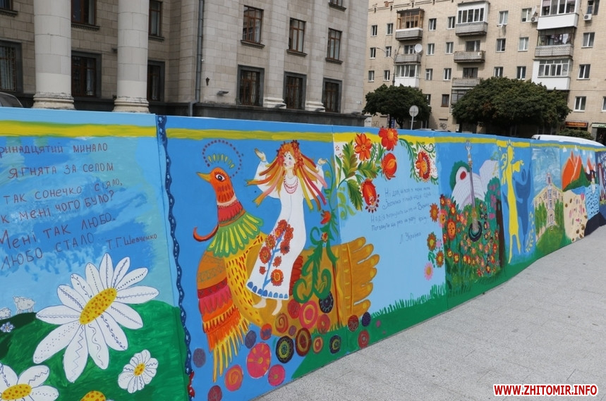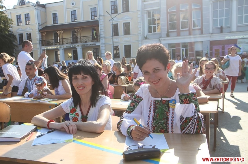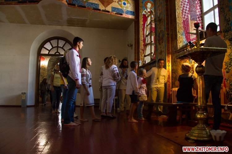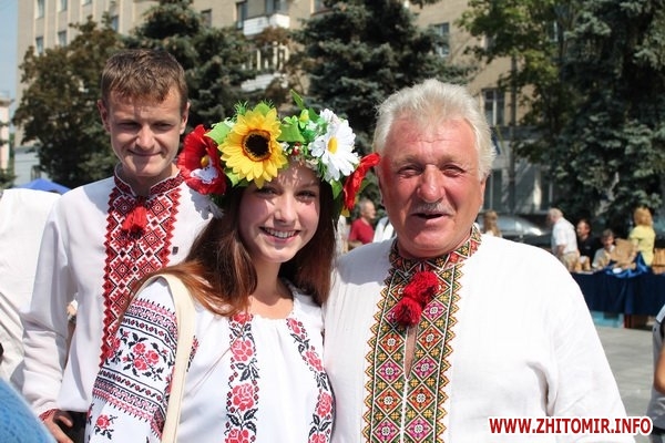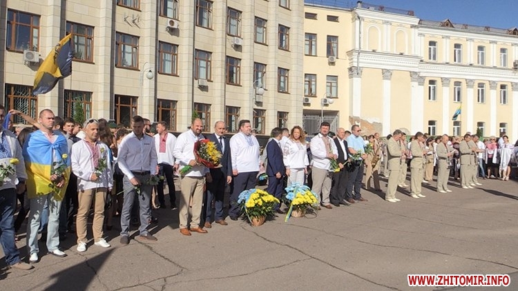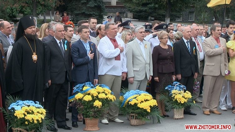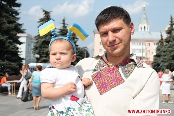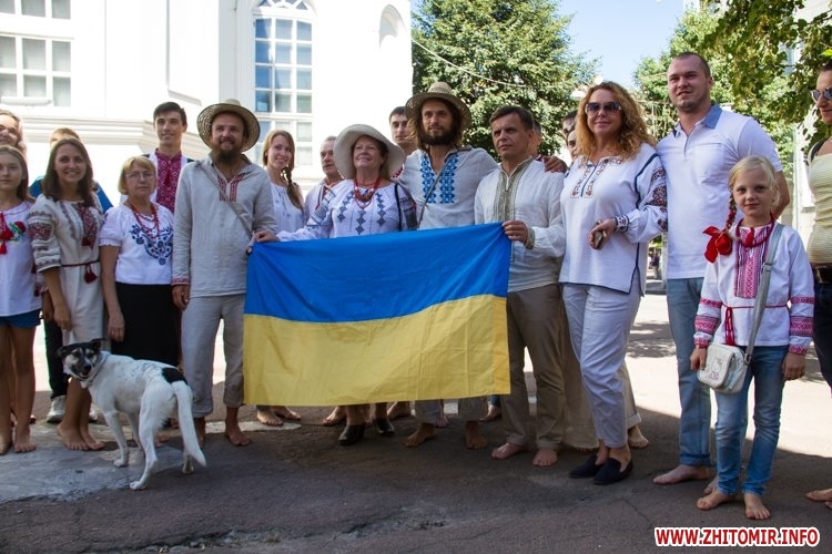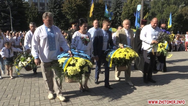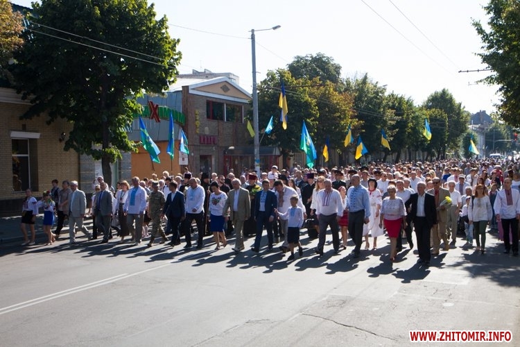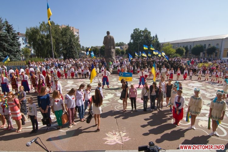 Урочистою ходою з квітами і прапорами житомиряни пройшли вулицею Великою Бердичівською від пам’ятника Тарасу Шевченку до майдану Корольова, там поклали квіти до стели героїв Небесної Сотні та вшанували хвилиною мовчання загиблих під Іловайськом військовослужбовців, а потім дивилися пряму трансляцію військового параду в Києві. А потім босі люди у вишиванках пройшлися від майдану Соборного до Михайлівської церкви, до цієї ходи долучився і мер Житомира.
