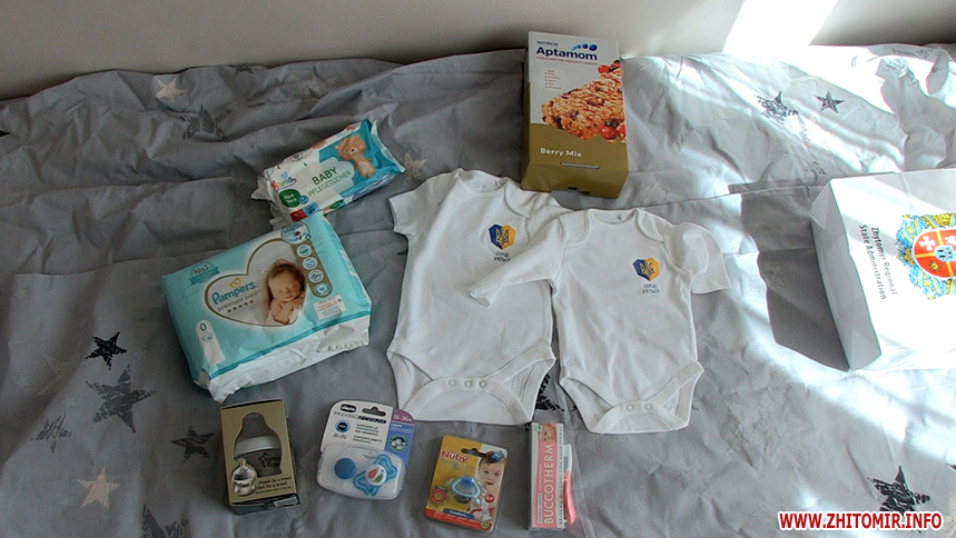 «Ми склали подаруночки, які надходять до нас, до гуманітарного штабу. Це і памперси, необхідні речі, які можуть знадобитися мамам і їх малюкам. А також, символічно подарували бодики, на яких символіка України до Дня Незалежності. Просто на згадку. Сподіваюсь, мами їх збережуть, коли ці діти виростуть сильні, здорові, щасливі, в незалежній Україні, вони матимуть такий подаруночок на згадку», - розповідає перша заступниця начальника Житомирської ОВА Наталія Остапченко.