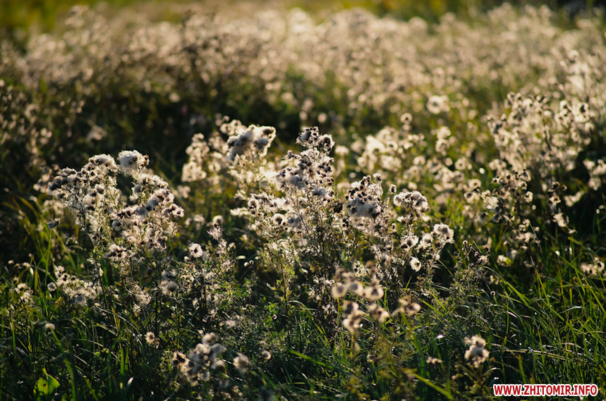 Буянням барв особливо тішать заміські пейзажі. Якщо прогулятися передмістям та околицями Житомира, можна помилуватися цвітом волошок, польових дзвіночків та навіть кропиви. У дворах приватного сектору достигають грушки, яблука та персики, а павуки вже почали готуватися до бабиного літа і заплітати усе павутинними візерунками.