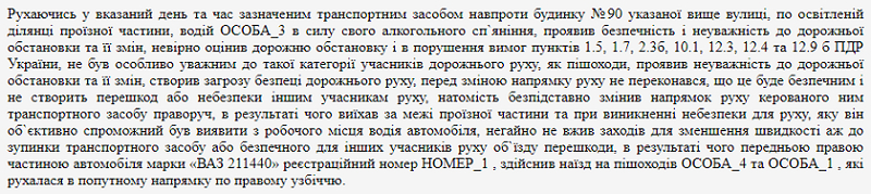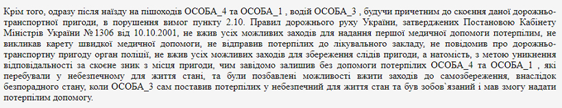 Крім того, збивши пішоходів, чоловік «не вжив усіх можливих заходів для надання першої медичної допомоги потерпілим, не викликав карету швидкої медичної допомоги, не відправив потерпілих до лікувального закладу, не повідомив про дорожньо-транспортну пригоду орган поліції, не вжив усіх можливих заходів для збереження слідів пригоди, а натомість, з метою уникнення відповідальності за скоєне зник з місця пригоди».