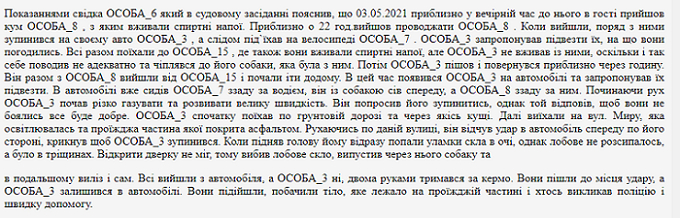 «В судовому засіданні обвинувачений ОСОБА_3 вину не визнав та не визнав цивільні позови про стягнення моральної шкоди. ОСОБА_3 дав показання, що працював оператором на ВАТ «Червоненський цукровик» 03.05.2021 їхав з роботи автомобілем «ВАЗ 211440» реєстраційний номер НОМЕР_1, який належить йому на умовах договору лізингу, мав посвідчення водія категорії «легкова». Коли їхав з роботи, темніло. Ще на роботі він вживав спиртні напої і сів за кермо автомобіля в нетверезому стані. В центрі смт Червоне знайомі хлопці запросили випити, на що він погодився. Їхав в магазин, що біля селищної ради, там з кимось зустрівся і випивав. Оскільки був дуже п`яний, поїхав на АДРЕСА_3, де знаходиться дача, яка належить його батькам. Не зміг відкрити замок і поїхав до ОСОБА_15, який живе неподалік, але той його прогнав. Повернувся на дачу, як відкрив не пам`ятає. Там він заснув і спав. Проснувся в автомобілі дільничого. Ключі від автомобіля постійно знаходились в нього в кармані, а дублікат знаходився в бардачку в автомобілі. Ніхто крім нього автомобілем не користувався і зазвичай він зберігався у подвір`ї батьків по АДРЕСА_4. Як його автомобіль опинився на місці ДТП, йому невідомо. ОСОБА_6, ОСОБА_7 та ОСОБА_8 йому знайомі, але в той вечір він їх не бачив. Неприязнених стосунків з ними не було і підстав для того, щоб вони його оговорили, не було. Чи вірні їх покази, не знає, оскільки нічого не пам`ятає», – йдеться у матеріалах суду.