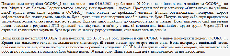 Як повідомляв Житомир.info, 4 травня 2022 року в смт Червоне Житомирської області ВАЗ збив двох пішоходів – 19-річну дівчину та 26-річного хлопця. Дівчину із травмами госпіталізували, а от молодий чоловік загинув на місці пригоди. Поліцейські затримали 29-річного водія, виявилося, що він перебував у стані алкогольного сп’яніння: вміст алкоголю в його крові становив близько 1,49 проміле.