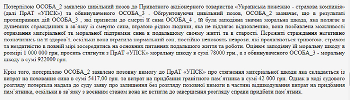 Позов про відшкодування моральної і матеріальної шкоди подавала й інша потерпіла – мати загиблого хлопця.