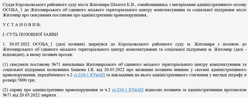 Парамонов 30 травня 2022 року звернувся до суду з позовом до Житомирського об`єднаного міського ТЦК та СП, в якому просив скасувати постанову начальника терцентру полковника Бацюна І.В. від 20.05.2022 про визнання позивача винним у скоєнні адміністративного правопорушення, передбаченого ч.2 ст.210-1 КУпАП та накладення на нього адміністративного стягнення у вигляді штрафу в розмірі 5000 грн та закрити справу про адміністративне правопорушення за ч.2 ст.210-1 КУпАП.