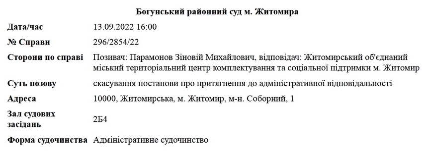 Колишній керівник державної установи «Житомирський обласний лабораторний центр Міністерства охорони здоров'я України» Зіновій Парамонов судиться з Житомирським об'єднаним міським територіальним центром комплектування та соціальної підтримки (раніше – військкомат).