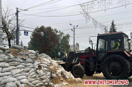 В центрі Житомирі біля будівлі міської ради почали розбирати «захисні споруди» з мішків, наповнених піском.