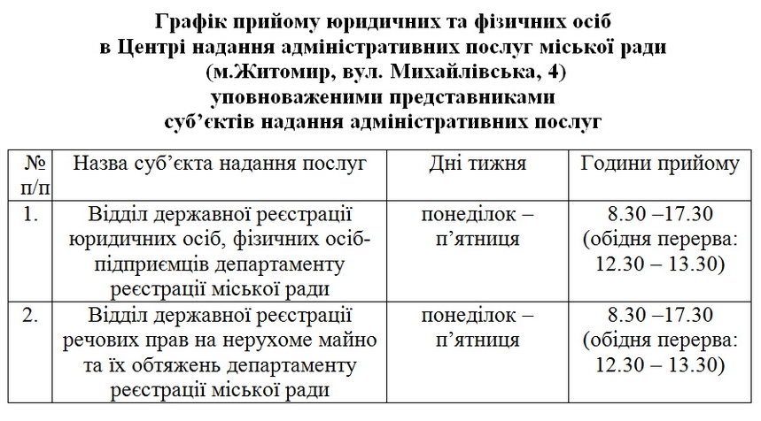 До проєкту рішення додаються графіки графік прийому юридичних та фізичних осіб в Центрі надання адміністративних послуг міської ради (м.Житомир, вул. Михайлівська, 4) та у «Прозорому офісі» (м.Житомир, пл. Польова, 8):