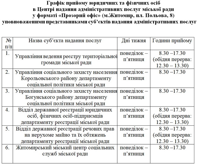 Влада Житомира хоче затвердити новий графік прийому юридичних та фізичних осіб в Центрі надання адміністративних послуг міської ради, в т.ч. у форматі «Прозорий офіс».