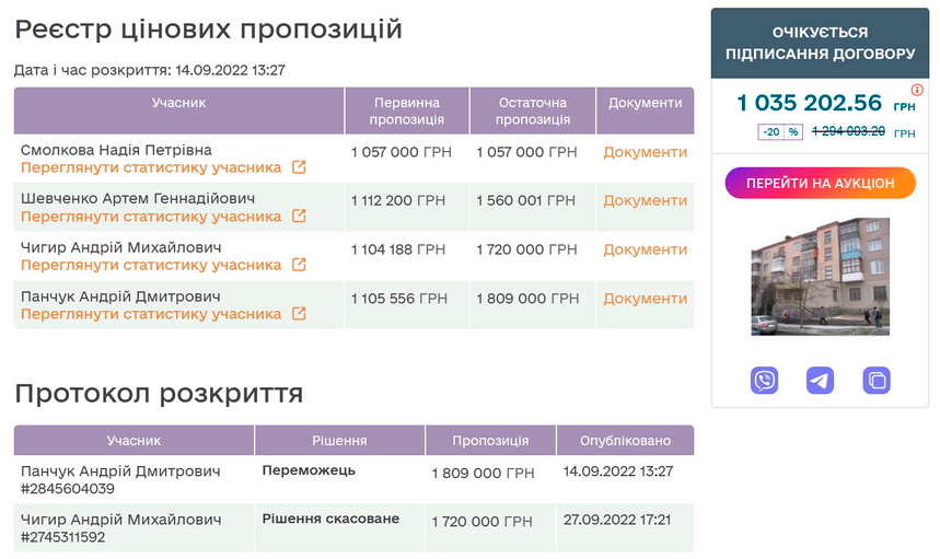 Зауважимо, що це вже третій аукціон з продажу цього приміщення. Перший був оголошений 11 серпня 2022 року зі стартовою ціною 1 млн 294 тис. 003,2 грн, єдиним учасником був Панчук Андрій Дмитрович з пропозицією 1 млн 301 тис. 556 грн, аукціон визнали таким, що не відбувся. Другий аукціон оголосили 29 серпня, початкову ціну знизили на 10% - до 1 млн 164 тис. 602,88 грн, учасників було двоє: Чигир Андрій Михайлович з пропозицією 1 млн 170 тис. 001 грн та Панчук Андрій Дмитрович з пропозицією 1 млн 171 тис. 555 грн, але аукціон знову визнали таким, що не відбувся.